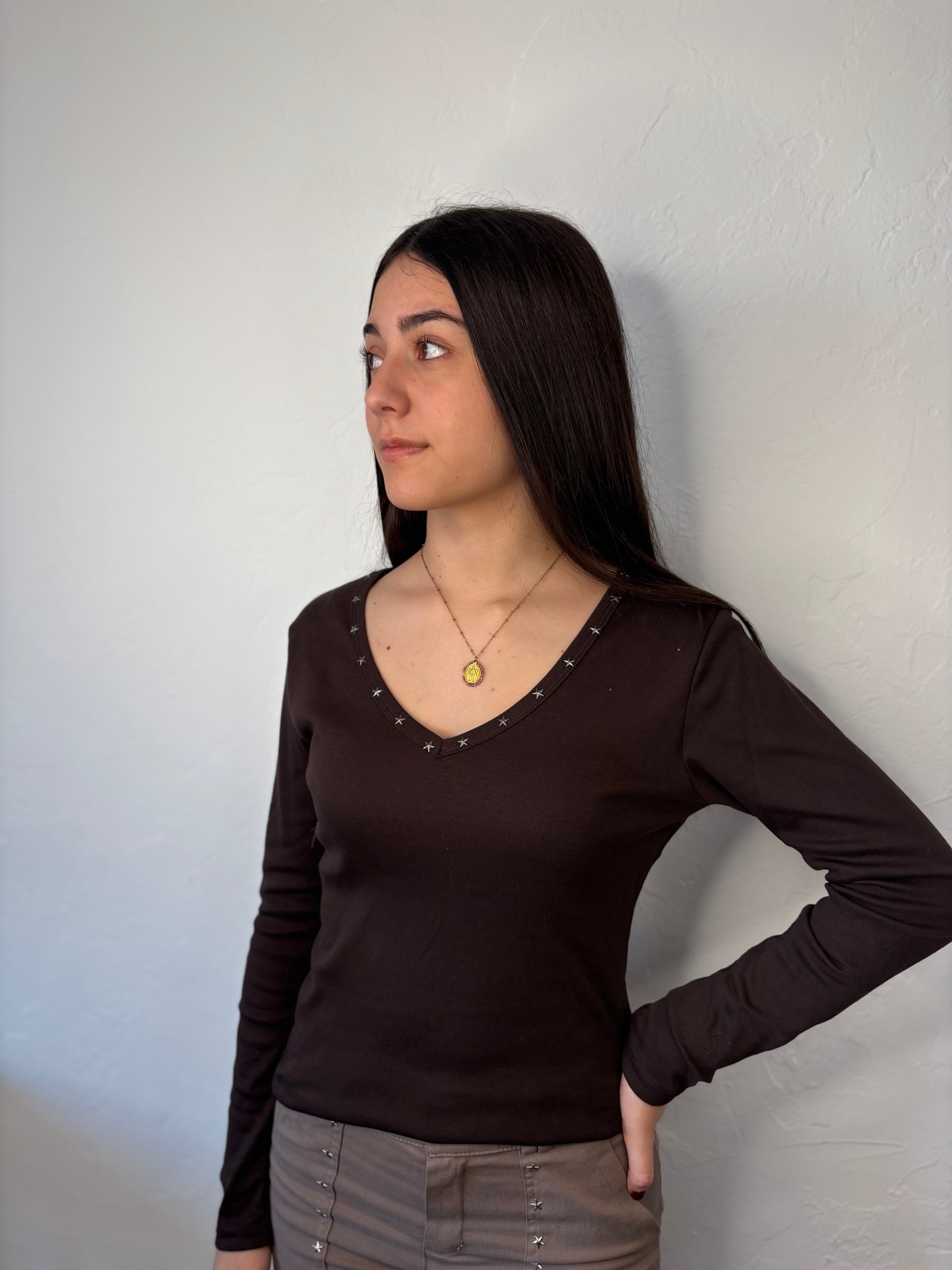 Camiseta con cuello de pico y tachuelas de estrella.