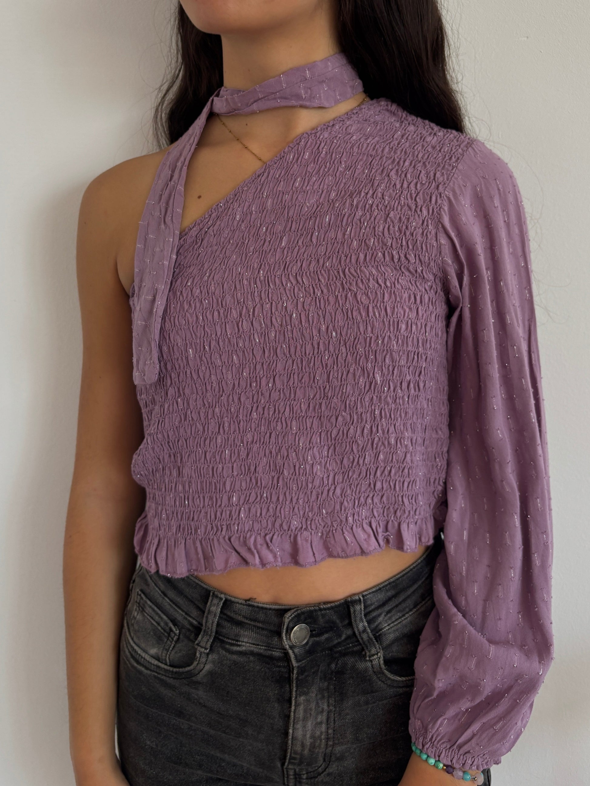 Top asimétrico de un solo hombro, con una manga larga y detalle de banda al cuello. Fabricado en tela con textura fruncida y sutiles hilos brillantes, aporta un estilo moderno y sofisticado. Perfecto para ocasiones elegantes o combinaciones casuales con un toque chic.